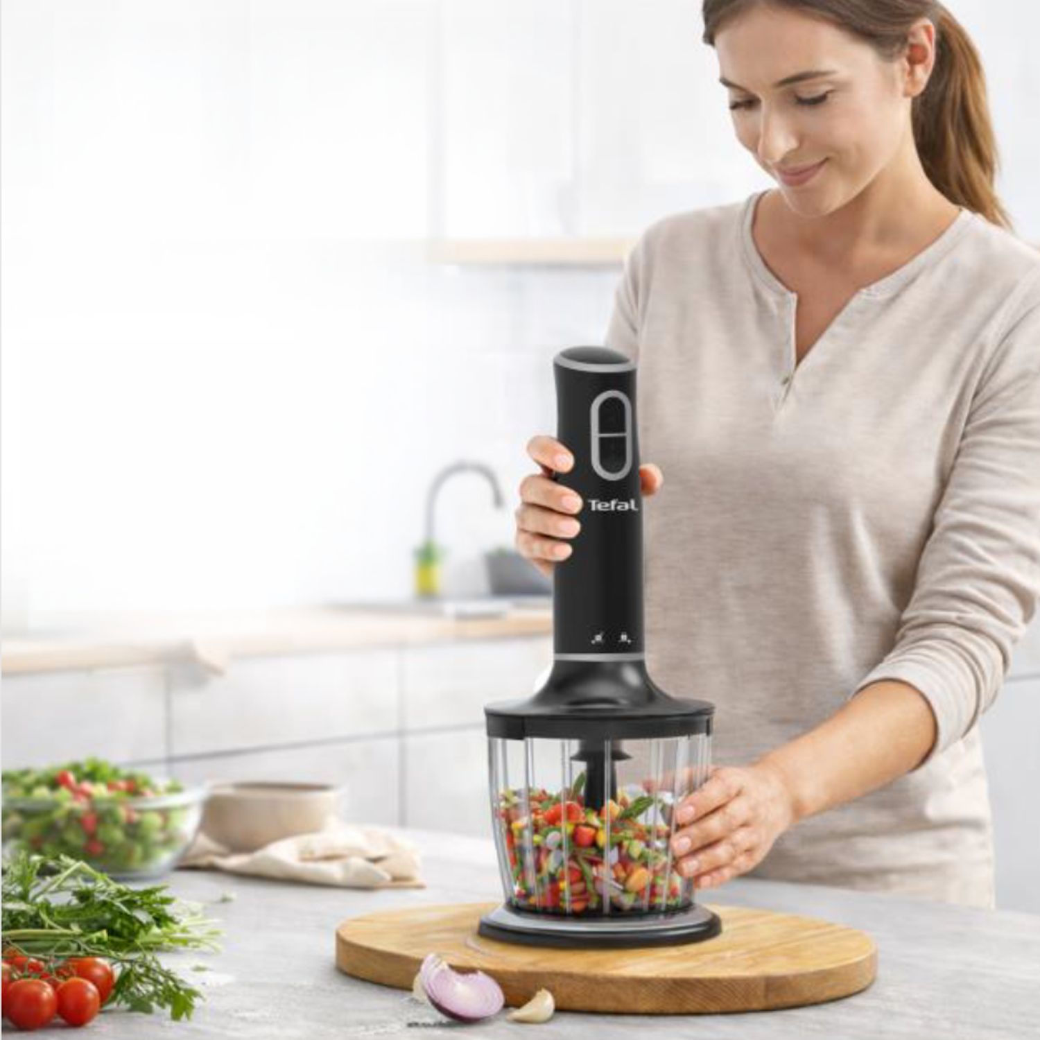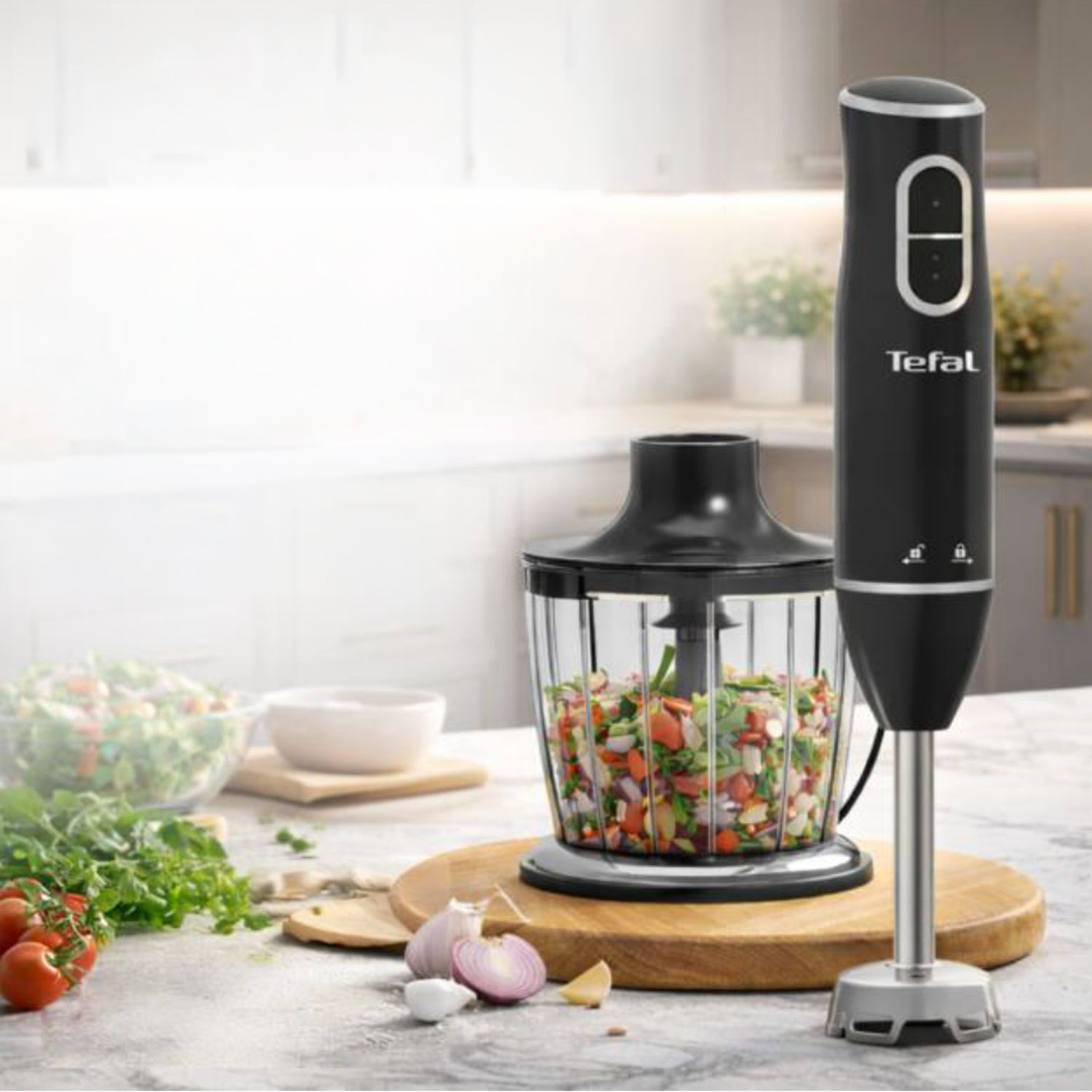 Includes a 600 ml chopper attachment for quick and effortless chopping. Includes a 600 ml chopper attachment for quick and effortless chopping.